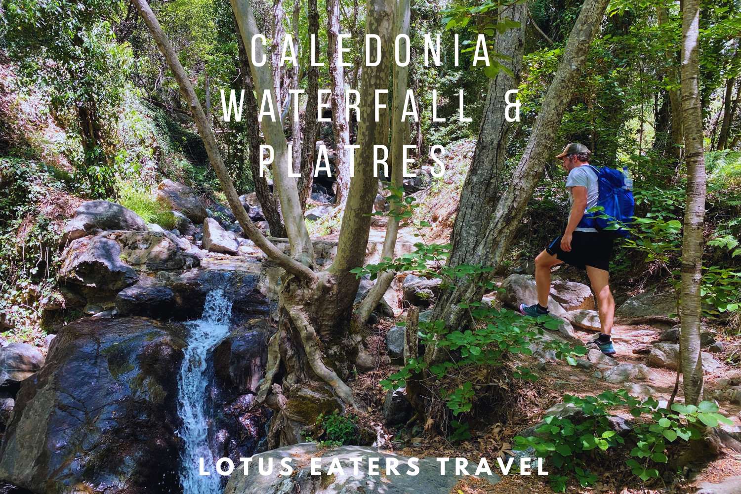 Caledonia Waterfall is found on the outskirts of Pano Platres (google map coords here) in the Troodos Mountain region of Cyprus. It is possible to reach it from a trail head above the waterfall, or below. We opted to hike from Pano Platres up to the waterfall, but if you were coming from Troodos, you would walk down to it.